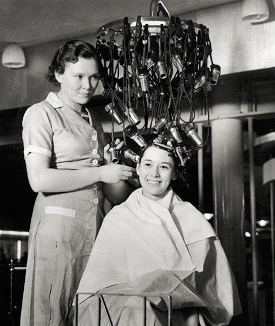 Mama was always home.? At that time she wore house dresses – always neat and clean.? She took me to Mary Kelley’s beauty salon to have my hair cut, until I was able to go by myself.? I saw her get permanents the old way.? Sometimes it kind of frightened me, when I watched Mary hook all those clips and cords on her head.? The machines looked like they came out of some mad scientist laboratory.